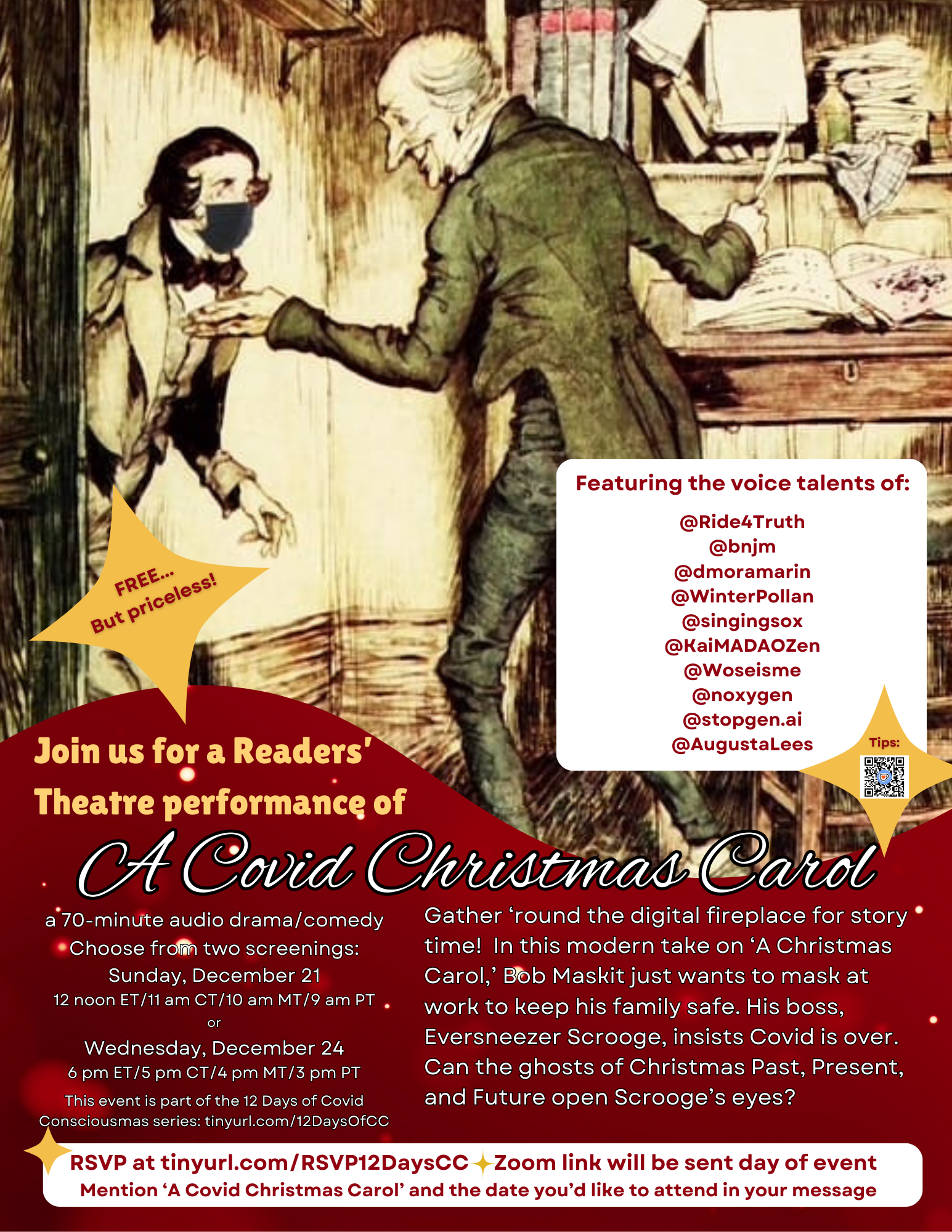 I hope you can join us on either December 21st or 24th for a screening of the 70-minute audio drama/comedy 'A Covid Christmas Carol,' featuring the voice talents of some incredibly talented folks you may recognize from CC Twitter/CC Bluesky. See flyer below for full details.