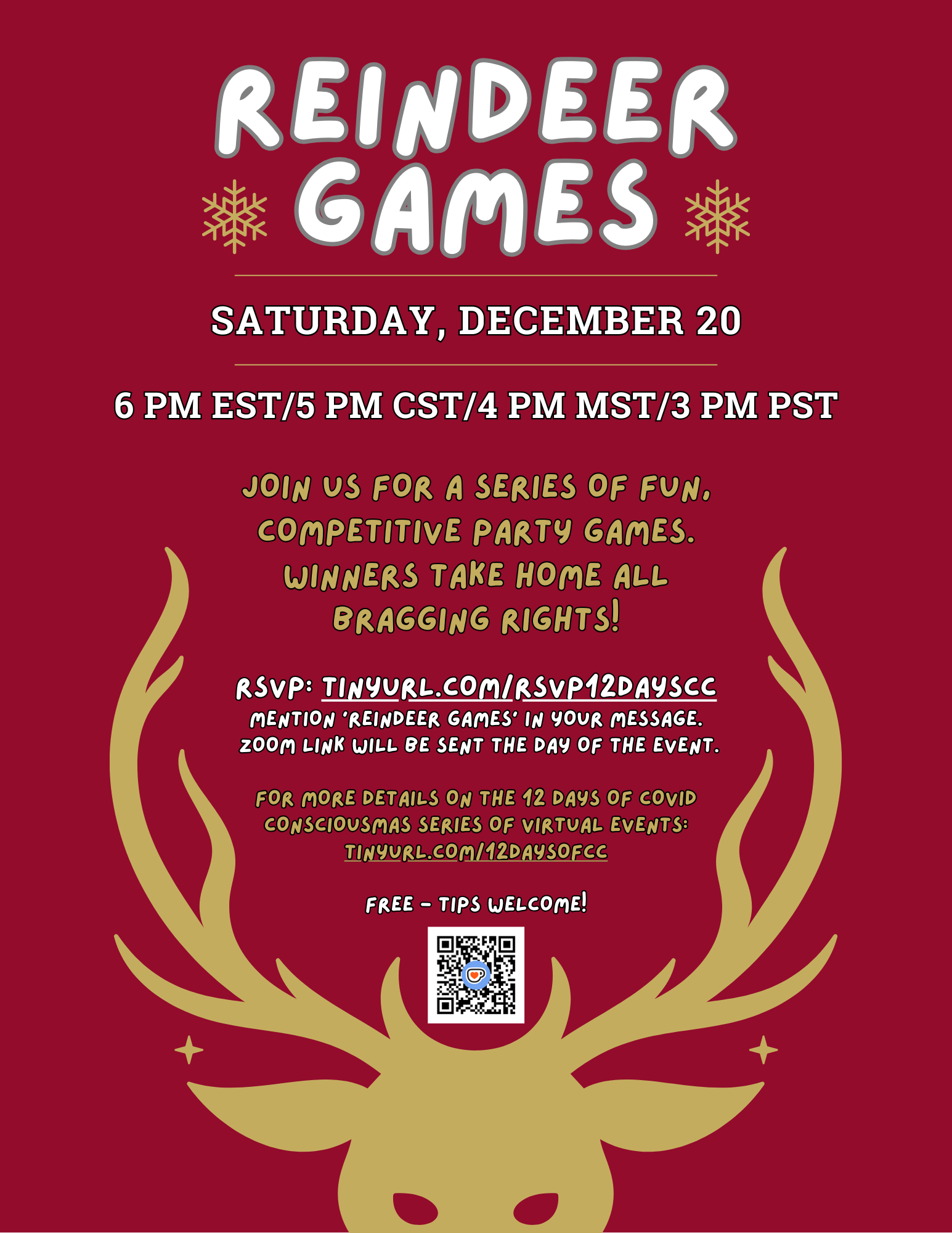 RSVP for any of the 12 Days of Covid Consciousmas events by sending a message here with the event names(s) and date(s) you'd like to join.