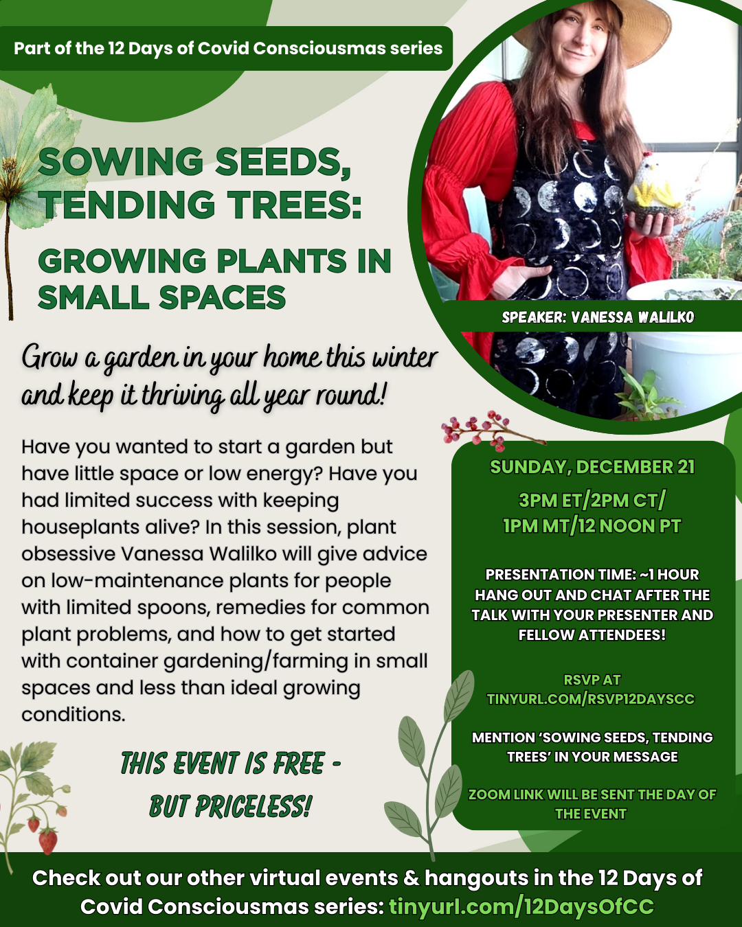 If you're thinking more about sustainable living these days, or if you've ever wanted to grow your own food but don't have an outdoor space for a garden, Vanessa Walilko has you covered. Join us on Sunday, December 21 for 'Sowing Seeds, Tending Trees: Growing Plants in Small Spaces.'
