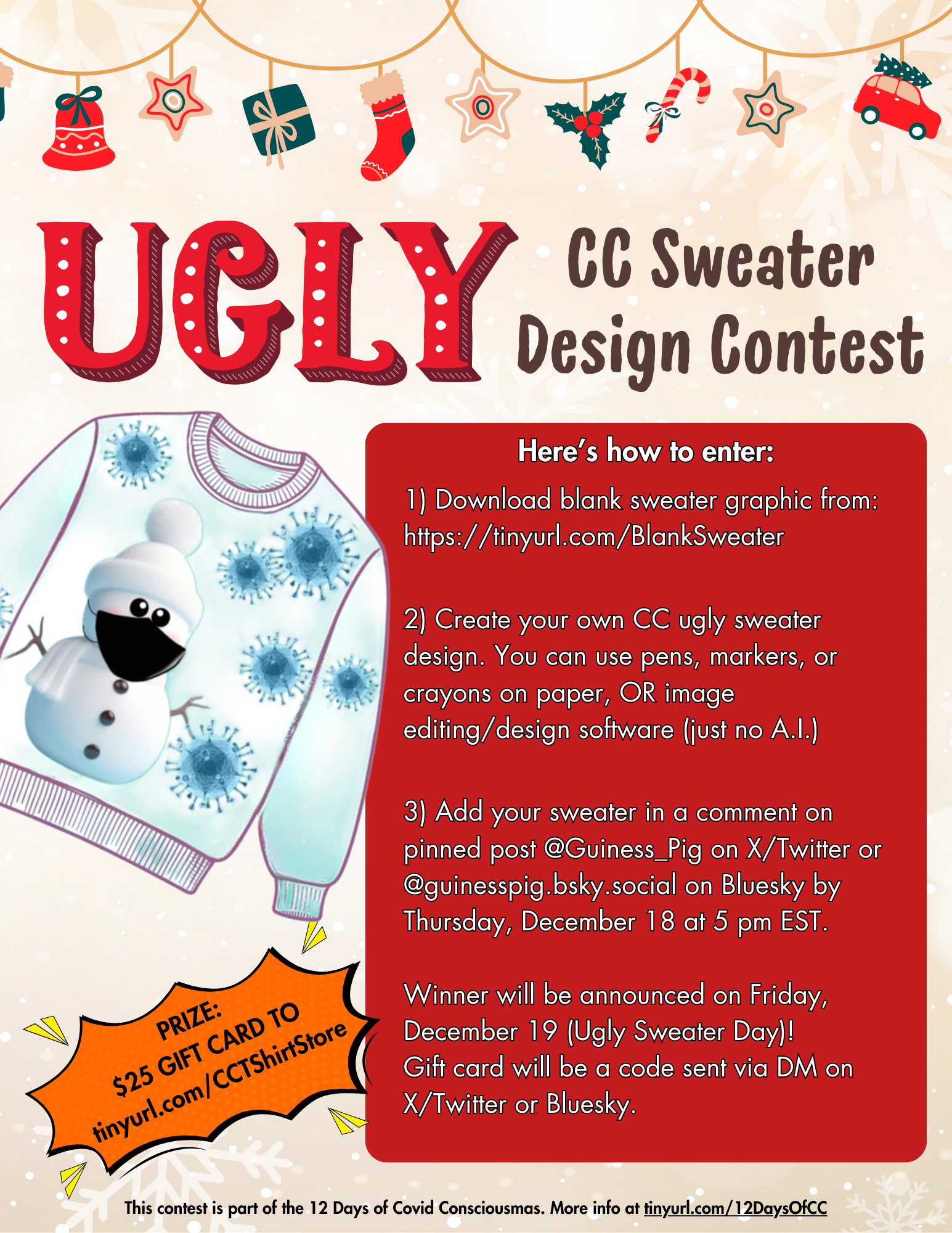 Ugly Holiday Sweater Day is this Friday, December 19, so here's an ugly sweater art contest for anyone who'd like to enter! Full details in flyer below. If you'd like to participate but you're not on X/Twitter or Bluesky, you can email your entry to me at TheRealGuinessPig@gmail.com. One winner will be chosen and announced on Friday the 19th, and will be sent a $25 gift card (by DM or email) to my CC T-shirt Shop on Bonfire.
